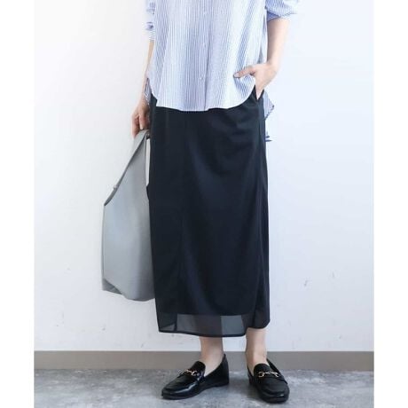 シアーな素材の可愛さを活かしたシンプルなロングタイトスカート。細身のシルエットも、とても良く伸びる素材なので窮屈感もなくストレスフリーに着こなせます。