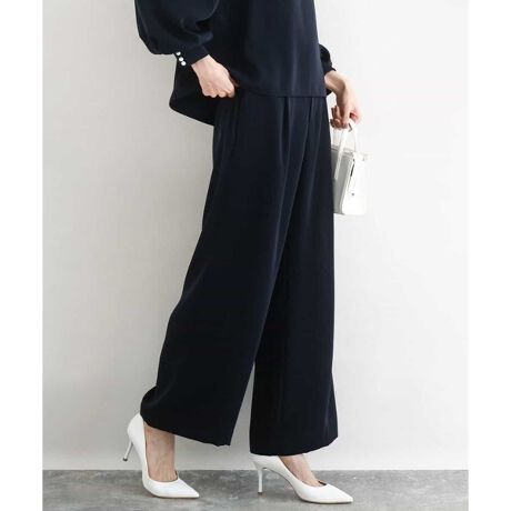 すっきりとしたワイドシルエットパンツ。ウエストには共地のベルトがついているので、ベルトのバックルがコーディネートのアクセントに。落ち感のある素材なので、ワイドシルエットですが上品な印象で履きこなしていただけます。