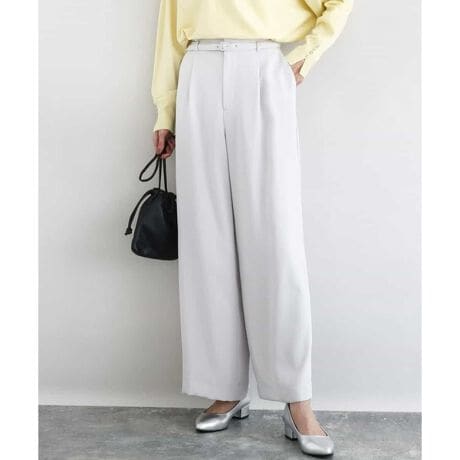 すっきりとしたワイドシルエットパンツ。ウエストには共地のベルトがついているので、ベルトのバックルがコーディネートのアクセントに。落ち感のある素材なので、ワイドシルエットですが上品な印象で履きこなしていただけます。