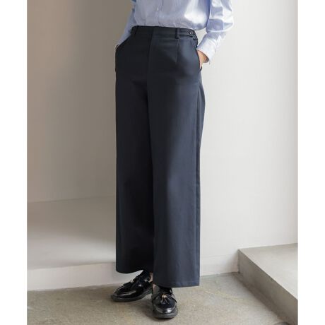 トレンド感とベーシックを兼ね備えた、きれいなシルエットが魅力のセミワイドパンツ。ダーツディテールにすることで、腰周りをすっきりとシャープに見えるよう仕立てました。ウエストベルトは前タブのボタンで細やかな調節が可能。さらに後ろ側はゴム入り仕様で、締め付け感が少なく快適にご着用いただけます。オールシーズン着用できる素材感のため、汎用性が高いのも魅力です。シンプルな着こなしはもちろん、ブラウスなどを合わせた女性らしいスタイルまで幅広く活躍してくれます。1本持っていると心強い、大人のワードローブに欠かせないベーシックアイテムです。