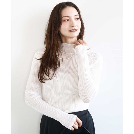 インナー使いにおすすめなシアーリブニット。裾や袖口の繊細な編み出しや透け感、凹凸のある編み地がニットならではの上品な仕上がりに。衿は身頃続きのハイネックなので接ぎ目のないすっきりとした印象。