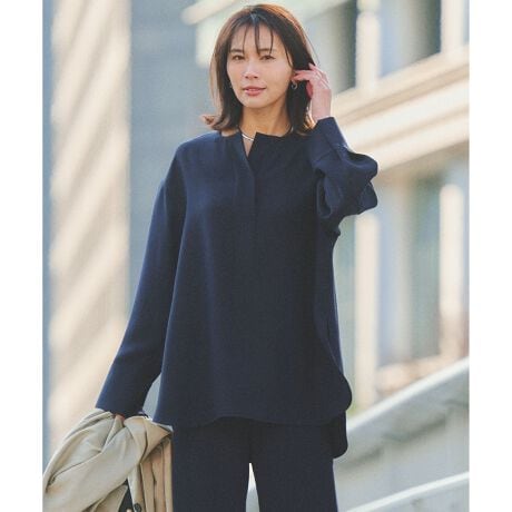 ■デザインオーバーサイズのシルエットがモードな印象のノーカラーブラウス。ゆったりとしたサイズながら落ち感のある素材で広がりすぎず、抜け感のあるスタイルが叶います。ミニマルなデザインながら、大きめのカフスと深めのスリットがアクセントになるので、さっぱりしすぎない印象に。同素材のボトムとセットアップでの着用もおすすめです。・ドライダブルクロス タックテーパードパンツ(PRUMLS0101)