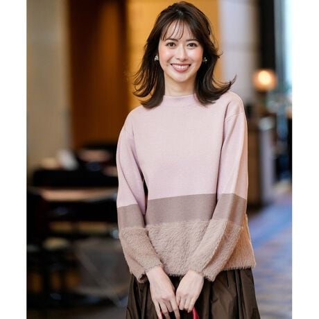 ・フェザーがポイントのカラーブロッキングニット・編み続きで内側に折り返された程よいスタンドネック・裾部分と袖部分のフェザーでコートの中でも映える一着・パンツに合わせやすいレングス感