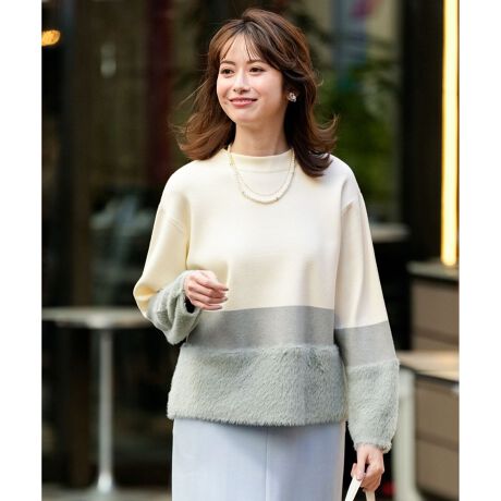 ・フェザーがポイントのカラーブロッキングニット・編み続きで内側に折り返された程よいスタンドネック・裾部分と袖部分のフェザーでコートの中でも映える一着・パンツに合わせやすいレングス感