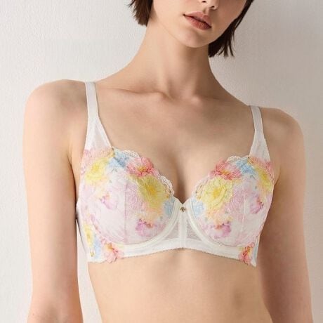 ガーベラやネモフィラなどの鮮やかな花々をモチーフにしたプリントのストレッチレースに、リボンモチーフのアップリケを使用した、フェミニンなシリーズです。