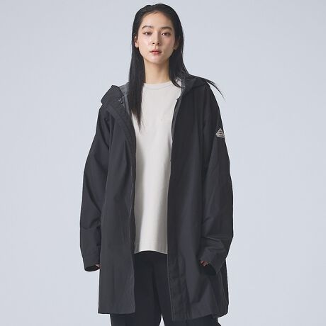 防風、撥水、透湿性に優れ、簡易的な防水にも対応したフーデッドロングコートです。