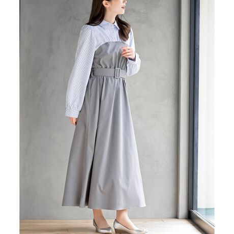 無地×ストライプシャツドッキングワンピース
