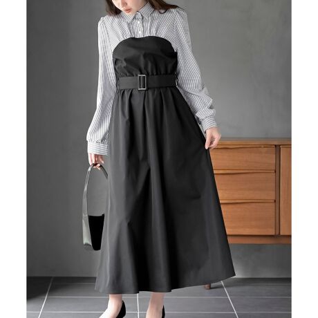 無地×ストライプシャツドッキングワンピース
