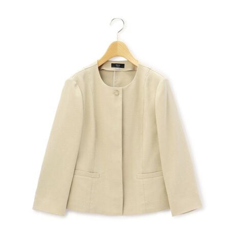 一つボタンのシンプルな長袖ジャケット。襟のないエレガントなノーカラー、ダーツの入った立体感のあるすっきりとしたシルエットも特徴。ストレッチ素材で、身体の動きにフィットし快適な着心地なのもうれしいポイント。お出かけにはもちろん、フォーマルなシーンにもマッチするシックなムードの一枚です。