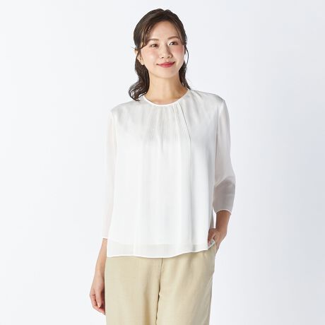 さりげない光沢感のある楊柳サテン生地で仕立てた長袖ブラウス。小さなドット柄地とフロント首元の細かなプリーツがおしゃれなデザインポイント。透け感のある表生地が軽やかなムードを演出。エレガントなムードのデザインで、お出かけやフォーマルなシーンなど、様々なシーンにマッチするアイテムです。