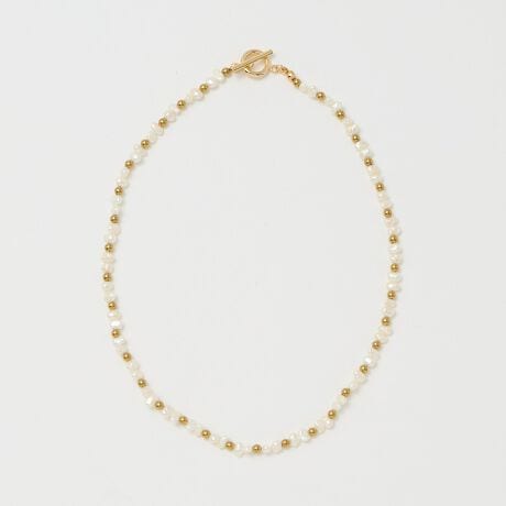 淡水パールとゴールドカラーにコーティングしたストーンを使用したショートネックレス。