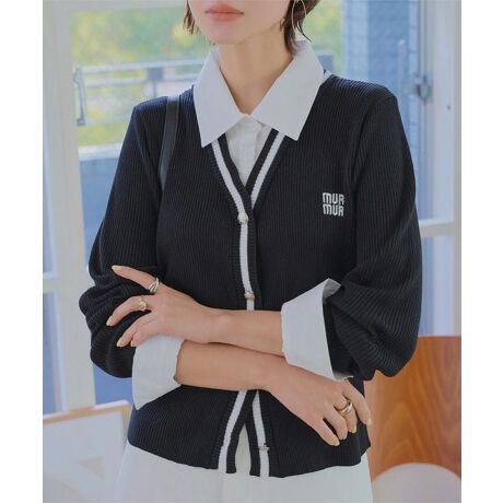 コンパクトシルエットのカーディガンにシャツをレイヤードしたデザインで、1枚でコーディネートが完成されるニットトップスです。