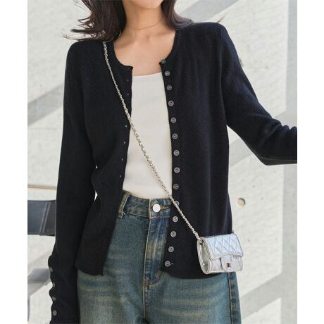 さりげない肌見せや、インナー見せのレイヤードなどボタンの開け具合で着方のアレンジも楽しめるニットカーデです◎