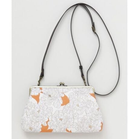 [型番:7JNP6105-2026]金鳳花(きんぽうげ)、芍薬(しゃくやく)、百合(ゆり)の花々を金銀のジャガード織りで上品に表現したがま口型クラッチバッグ。織りの光沢が上品にきらめき、伝統の和柄をモダンに仕上げています。取り外し可能な紐付きで、クラッチとしてもショルダーとしても使える2WAY仕様。和装にも洋装にも映える、気品あふれるデザインです。