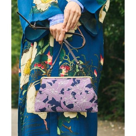[型番:7JNP6105-2026]金鳳花(きんぽうげ)、芍薬(しゃくやく)、百合(ゆり)の花々を金銀のジャガード織りで上品に表現したがま口型クラッチバッグ。織りの光沢が上品にきらめき、伝統の和柄をモダンに仕上げています。取り外し可能な紐付きで、クラッチとしてもショルダーとしても使える2WAY仕様。和装にも洋装にも映える、気品あふれるデザインです。