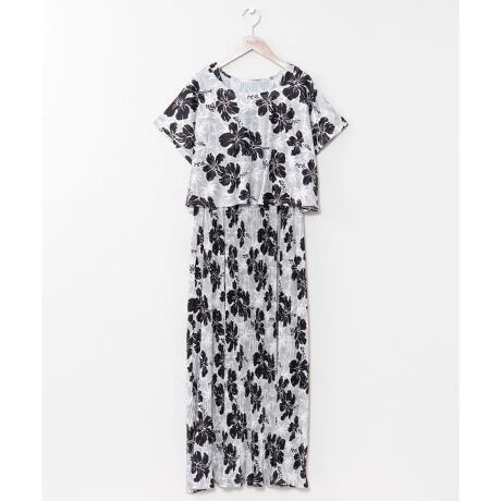 [型番:42B-6103-2026]トップスとワンピースのセットアイテム。ハワイをイメージしたボタニカル柄が華やかで、涼しげなカットソー素材が快適な着心地を実現。トップスとワンピースは別々にも着用でき、ワンピースはプリーツ加工でスタイルアップ効果も期待できます。トップスとワンピースのセット商品