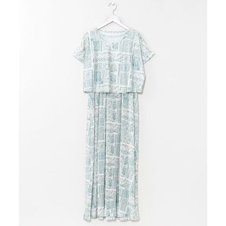 [型番:42B-6103-2026]トップスとワンピースのセットアイテム。ハワイをイメージしたボタニカル柄が華やかで、涼しげなカットソー素材が快適な着心地を実現。トップスとワンピースは別々にも着用でき、ワンピースはプリーツ加工でスタイルアップ効果も期待できます。トップスとワンピースのセット商品
