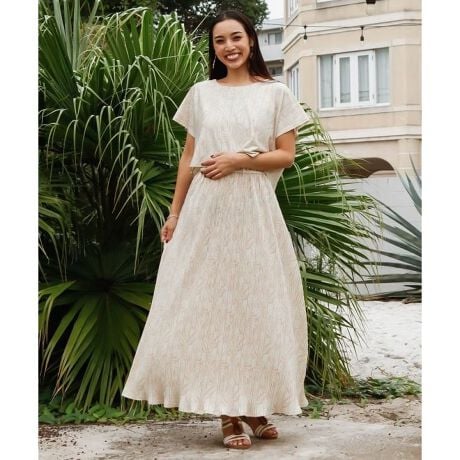 [型番:42B-6103-2026]トップスとワンピースのセットアイテム。ハワイをイメージしたボタニカル柄が華やかで、涼しげなカットソー素材が快適な着心地を実現。トップスとワンピースは別々にも着用でき、ワンピースはプリーツ加工でスタイルアップ効果も期待できます。トップスとワンピースのセット商品