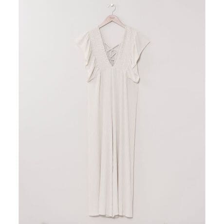 [型番:42B-6101-2026]柔らかなカットソー素材を使用したプリーツサロペット。一枚でコーディネートが完成し、涼しげな印象を演出します。紐の先端にはメタルパーツをあしらい、上品さをプラス。スタイルアップ効果も抜群です。