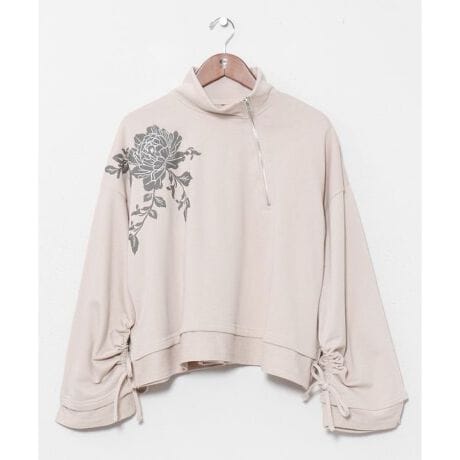 [型番:COT-6105-2026]東洋の美と西洋の感性が融合した「シノワズリ」のエッセンスをまとった個性派トップス。牡丹(ぼたん)プリントと銀糸の刺しゅうが目を惹き、裏毛素材の表情を活かした切替でレイヤード風に見せる工夫も。袖口のドローコードでシルエットに変化もつけられる一枚。