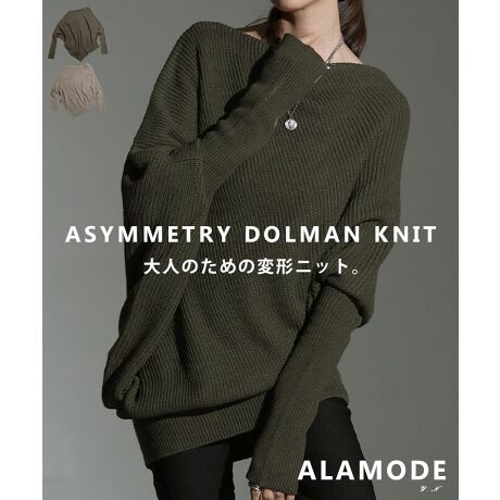 アシンメトリーな変形デザインが目を惹くニットチュニック。ボートネックが大人っぽさを引き立て、長めの丈感でヒップまわりもさりげなくカバーします。着るだけでモードに決まる、存在感のある一枚です♪