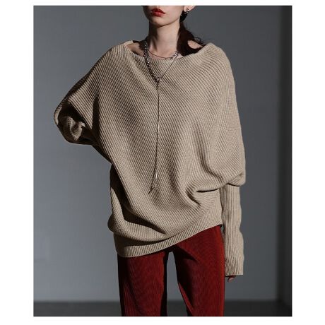アシンメトリーな変形デザインが目を惹くニットチュニック。ボートネックが大人っぽさを引き立て、長めの丈感でヒップまわりもさりげなくカバーします。着るだけでモードに決まる、存在感のある一枚です♪
