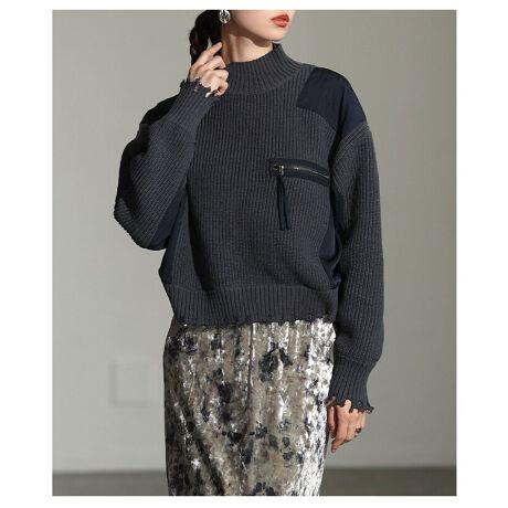 ニットにミリタリー要素を効かせた、ありそうでなかったデザインが魅力の一枚。ハイネックで首元までしっかり暖かく、肩やサイドに配した異素材がモードな雰囲気をプラス。フリンジ加工がさりげなくこなれ感を添えてくれます♪