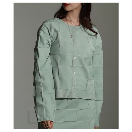 【トップス】 カーディガン ニット チェック エンボス 凹凸 立体 長袖 ボタン 黒 グレー ミント