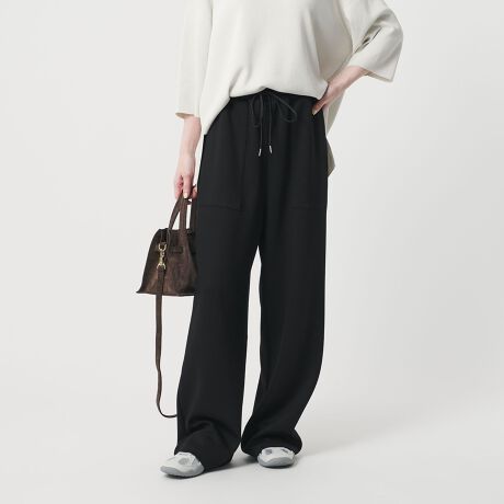 トレンドのスウェットパンツのようなラフさがありながら、落ち感のある滑らかな素材やすっきりとしたシルエットが大人のカジュアルスタイルにぴったりのアイテム。