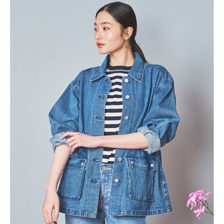 【淡色ブルー】: 強撚糸を使用した綿100%デニムは、ドライタッチな風合いが魅力。ムラ感が少ないため、カジュアルすぎず洗練された表情が特徴です。どちらのカラーも軽やかな着心地で、春のライトアウターとして活躍します。