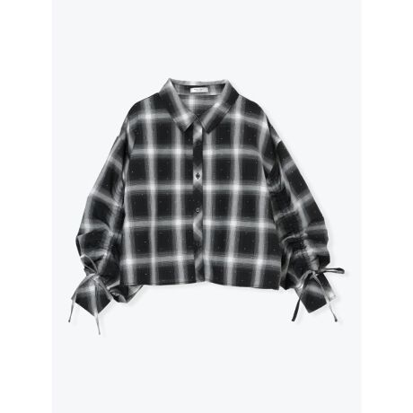 [型番:25560776255]煌びやかなラインストーンが散りばめられたシャツ。ショート丈のデザインになっており、ウエストラインをすっきり魅せる効果が得られます。スリーブに施されたギャザーで表情の変化を楽しめるのもポイント。シンプルな無地のボトムスと合わせたコーディネートがおすすめです。モデル(青着用)身長:160cmMサイズ着用