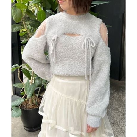 ふんわり柔らかなフェザーヤーンを使用した、女性らしさが引き立つ一枚。