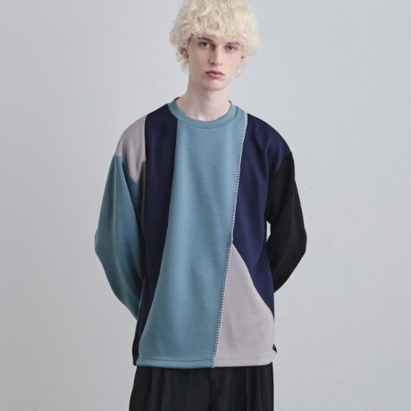 切り替え部分に施した、ブランケットの端をかがるような太番手のステッチが目を惹くデザインプルオーバー。