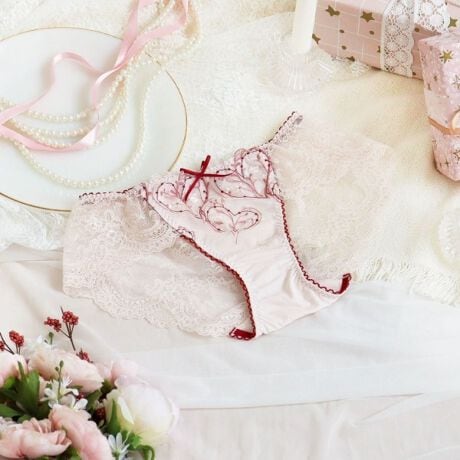 キラキラと輝く繊細な小花たちを散りばめた、リサマリのバレンタインシリーズです。フロントレースにはさりげなくハートデザインを刺繍して、バレンタインのエッセンスを少し取り入れた、上品で清楚な印象に。普通糸とラメ糸、厚みのあるウーリー糸を使用することで、大人っぽくも豪華な柄行きに仕上がりました。バックスタイルのリボンにはタッセルをイメージした3連のハートチャームをあしらい、特別感を演出。カラーはちょっぴり大人なスウィーツをイメージした、バレンタイン気分を盛り上げてくれるコレクションです。