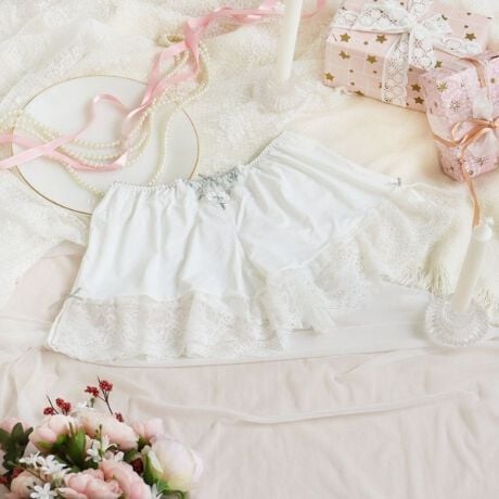 キラキラと輝く繊細な小花たちを散りばめた、リサマリのバレンタインシリーズです。フロントレースにはさりげなくハートデザインを刺繍して、バレンタインのエッセンスを少し取り入れた、上品で清楚な印象に。普通糸とラメ糸、厚みのあるウーリー糸を使用しました。裾にはストレッチレースを贅沢にほどこして、サイドにはスリットとリボンをあしらい、細部まで心ときめくデザインをお楽しみいただけます。お揃いのキャミソールとのコーディネートがおすすめです。カラーはちょっぴり大人なスウィーツをイメージした、バレンタイン気分を盛り上げてくれるコレクションです。