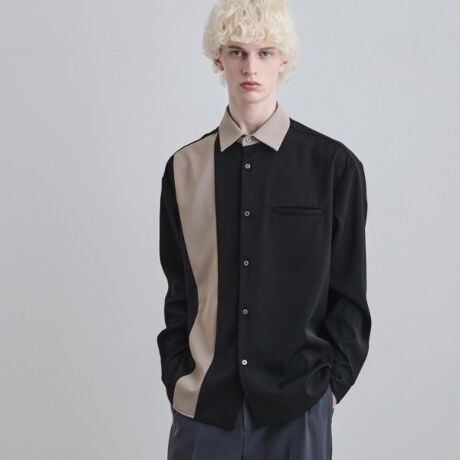 襟とフロントの縦ラインを大胆に切り替えた、レトロモダンな雰囲気のカラーブロックシャツ。