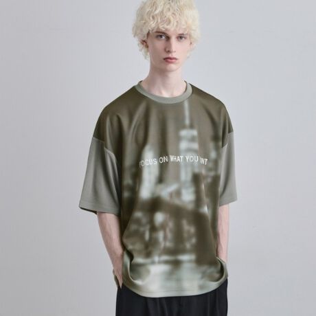 フロントに施した、総柄プリントと刺繍のコンビネーションが目を惹く半袖Tシャツ。