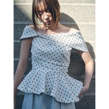 女性らしさ溢れるペプラムブラウスに、ワンショルデザインでモード感をプラスしました。