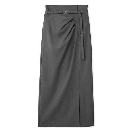 スタイルアップをアシストするハイウエストには華奢な共布ベルトをあしらい、上品なポイントに。
