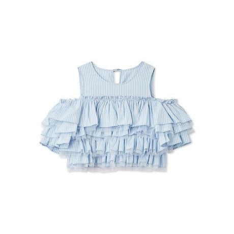 優しい光沢感のあるストライプ生地にチュールを挟み込んだティアードブラウス。