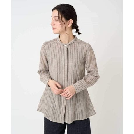 ストライプ柄のウールガーゼを使用したブラウス。リファイン加工された生地は軽くて優しい肌触りで着心地の良いブラウスです。襟は小さめなデザインでブラウス単体としても羽織のスタイルでもすっきりと着こなせます。胸元はコンパクトに、脇にはマチを入れ優しく裾に広がるシルエットです。上品さとリラックス感が調和したブラウス。季節の変わり目や旅行・お出かけにもぴったりなアイテムです。