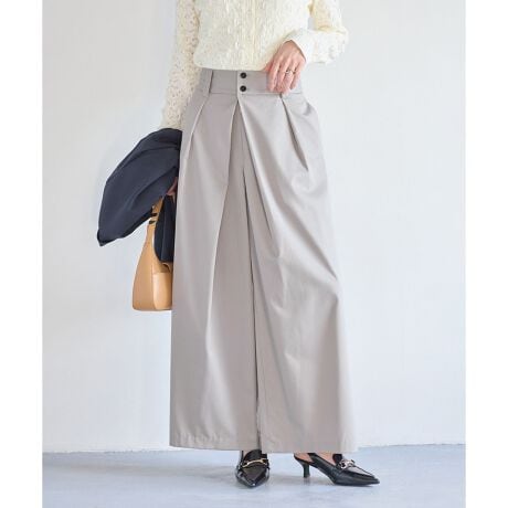 タックデザインのワイドシルエットなので、トップスはすっきりしたものと合わせるのがおすすめ!