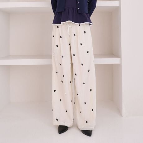・ナチュラルな花柄刺繍が目を引く、イージーパンツ