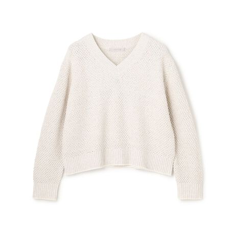 ■デザイン表情豊かな素材感で、1枚でサマになるVネックプルオーバー。2色の糸が混ざり合うことで、淡色にはない奥行きと立体感を演出します。袖ぐりと裾の編みだしに入れた、細いオフのラインがアクセントに。