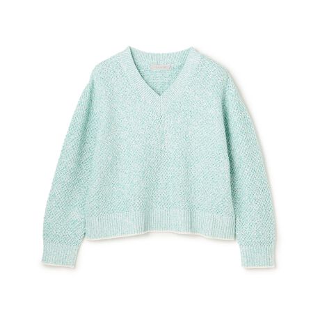 ■デザイン表情豊かな素材感で、1枚でサマになるVネックプルオーバー。2色の糸が混ざり合うことで、淡色にはない奥行きと立体感を演出します。袖ぐりと裾の編みだしに入れた、細いオフのラインがアクセントに。