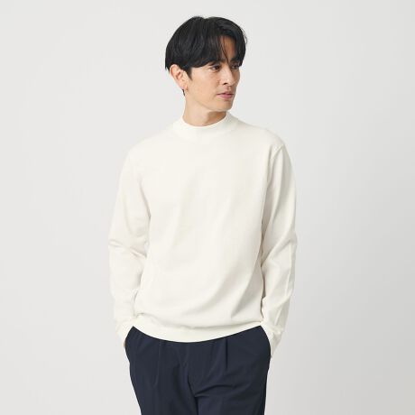 ジャケット着用時に衿が干渉しないよう、首元は絶妙な高さに設定し、程よいボリュームを持たせることで、通常のクルーネックよりも上品で端正な印象を演出します。