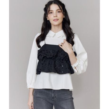■デザインこだわりのフラワー刺繍を施した、グログラン生地のビスチェ。上質なグログラン素材に繊細な花柄刺繍を重ねることで、立体感と華やかな存在感を引き立てます。胸下にはギャザーを絞るための調節仕様を施し、サイズ感を自在に調整できる実用性も魅力。華奢な印象を与える細ストラップがアクセントとなり、女性らしい抜け感を演出します。フリルタートルニットやフリル衿ブラウスとレイヤードするだけで、スタイリングに奥行きとトレンド感をプラスします。■素材張りがありシワになりにくい、上品なグログラン素材に、丁寧に穴を開けながら上品な花柄を刺繍したオリジナル素材。・水洗い可・裏地あり■サンプル撮影商品画像の商品はサンプルです。実際の商品とはサイズや色味、素材、デザイン等の仕様が若干変更になる場合がございます。■カラーについては、可能な限り実際の商品に近いカラーにて撮影をおこなっておりますが、照明の関係により実際の製品とは色味が違って見える場合があります。またパソコン・スマートフォンなどの環境により、若干製品と画像のカラーが異なる場合もございます。現物と画像のカラー差異については返品理由となりませんので、予めご了承ください。■サイズ表記はあくまで目安となります。