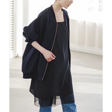 シアー素材とサテン素材を組み合わせたデザイン。着丈に差を設けているため、一枚纏うだけで自然とレイヤードを楽しめるのが一番のポイント。