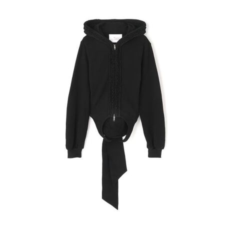 フロントの立体的な編み装飾と、バックスタイルの大胆なリボンディテールが印象的なフーディージャケット。シンプルなブラックボディに、存在感のあるデザインを落とし込むことで、モードかつエッジの効いた一着に仕上げています。フロントはダブルジップ仕様で、開け方次第でシルエットやレイヤードの表情を自在にアレンジ可能。背面のロングリボンが動きを生み、後ろ姿まで抜かりなく主張します。スカートや細身パンツと合わせたスタイリングはもちろん、あえてワイドボトムと合わせることでジェンダーレスな着こなしもおすすめ。コーディネートの主役として活躍するアイテムです。
