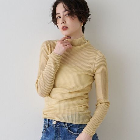 繊細な透け感が魅力の防縮Wシアータートルリブニット。